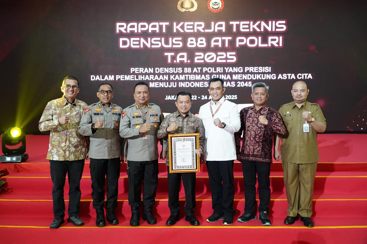 Jakarta – Gubernur Jambi Al Haris menjadi satu-satunya Gubernur yang mendapatkan penghargaan dari Kepala Kepolisian Negara Republik Indonesia Jendral Polisi Listyo Sigit Prabowo. Penghargaan itu diberikan langsung dalam acara Rakernis Densus 88 AT Polri yang bertempat di Auditorium Sekolah Tinggi Ilmu Kepolisian (STIK) PTIK, Kebayoran Baru Jakarta Selatan. Selasa (22/04/2025).