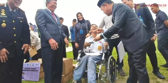 Penyerahan bantuan ini digelar secara simbolis di lapangan depan Kantor Gubernur Jambi, usai upacara peringatan Hari Sumpah Pemuda, Selasa (28/10/2025).