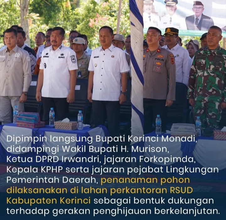 Dipimpin langsung Bupati Kerinci Monadi, didampingi Wakil Bupati H. Murison, Ketua DPRD Irwandri, jajaran Forkopimda, Kepala KPHP serta jajaran pejabat Lingkungan Pemerintah Daerah, penanaman pohon dilaksanakan di lahan perkantoran RSUD Kabupaten Kerinci sebagai bentuk dukungan terhadap gerakan penghijauan berkelanjutan.