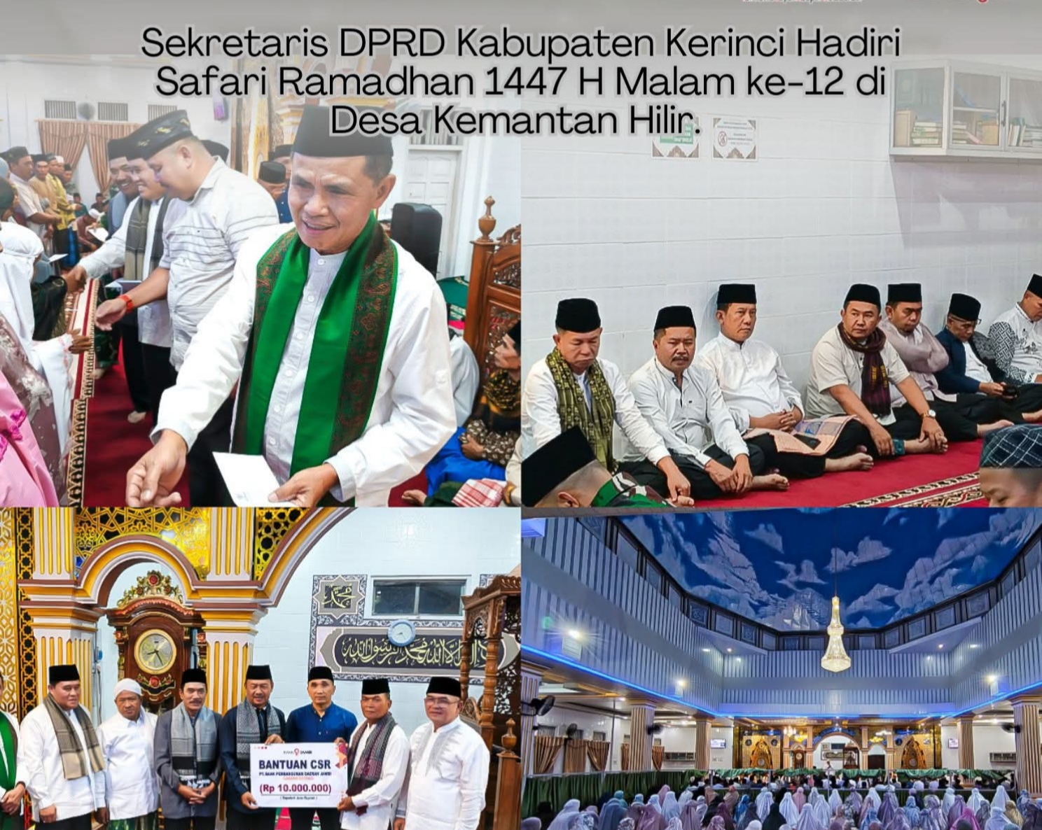 Kerinci daily.com…Kerinci – Sekretaris DPRD Jondri Ali, S.E., M.Si Dan Anggota DPRD Kabupaten Kerinci Zulkismi, SE. Menghadiri kegiatan Safari Ramadhan 1447 H yang digelar di Masjid At-Taqwa, Desa Kemantan Hilir, Kecamatan Air Hangat Timur. Malam ke – 12 Ramadhan. Minggu, 01 Maret 2026.