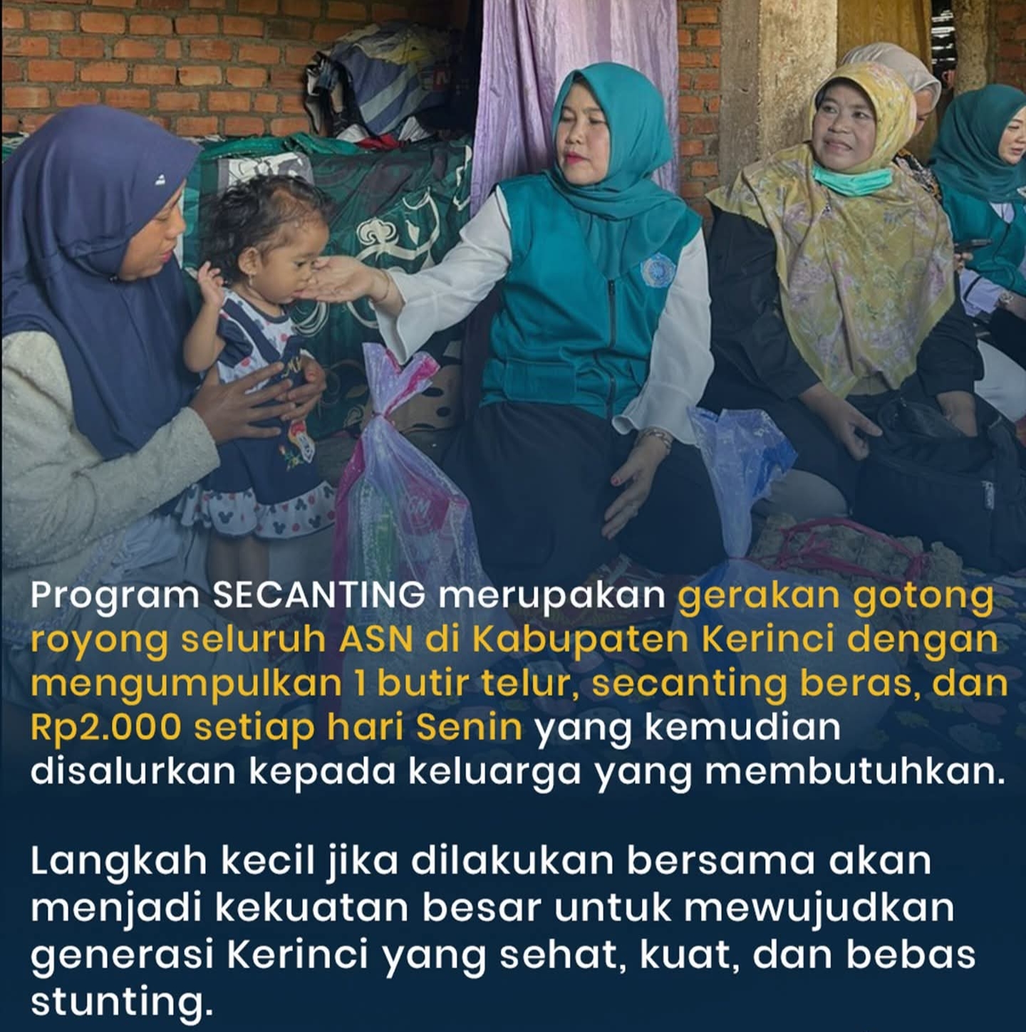 Program SECANTING merupakan gerakan gotong royong seluruh ASN di Kabupaten Kerinci dengan mengumpulkan 1 butir telur, secanting beras, dan Rp2.000 setiap hari Senin yang kemudian disalurkan kepada keluarga yang membutuhkan.